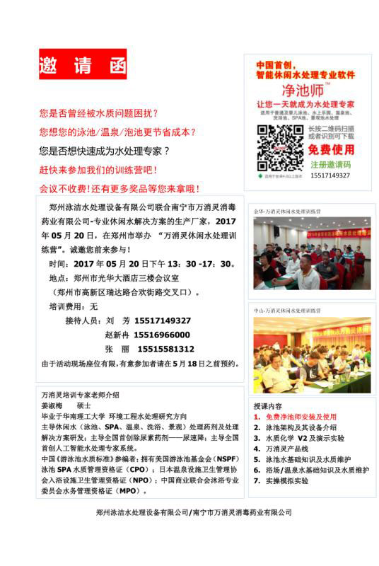 了解更多+鄭州泳潔水處理設(shè)備有限公司聯(lián)合南寧萬消靈消毒藥業(yè)有限公司-專業(yè)休閑水解決方案的生產(chǎn)廠家,2017年05月20日(這周六),在鄭州市舉辦“萬消靈休閑水處理訓(xùn)練營”,誠邀您前來參與!