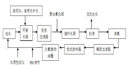 本設(shè)計泳池的進回水方式,采用淺水端池壁進水、深水端池底回水和池面排水相結(jié)合的順流循環(huán)方式,采用這種方式,既能有效去除沉積于底部的污物,又可去除浮于水面的毛發(fā)及其它輕質(zhì)漂浮物。保證了全池水質(zhì)的均勻。工藝流程圖如下圖所示: