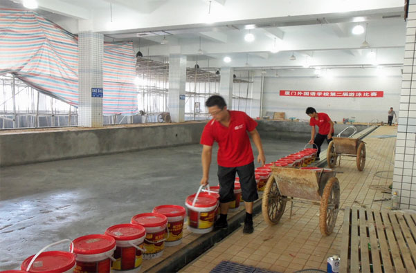 裝修施工前須對(duì)泳池蓄水48小時(shí)試驗(yàn),灌水后池壁外表面不得出現(xiàn)陰濕,每晝夜水量損耗小于每方2升,以檢驗(yàn)砼的抗?jié)B效果,確不滲漏,才進(jìn)行裝修施工,否則需采取措施,直至不滲水為止,再進(jìn)入裝修。