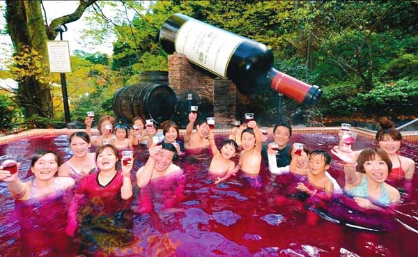 紅酒浴,紅酒有助于美容養(yǎng)顏、養(yǎng)氣活血,緩解皮膚松弛,紅酒對輕微貧血的女性有好處,促進(jìn)胃腸消化能力。躺在浴池中,有木有微醺的感覺呢。