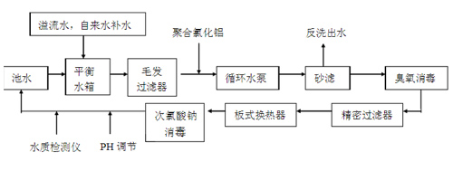 本方案采用當(dāng)今世界先進(jìn)的水?dāng)M定工藝為典型的游泳池循環(huán)水處理工藝,其目的主要是去除水中懸浮雜質(zhì),消毒滅菌,滿足衛(wèi)生要求。正常循環(huán)時(shí),游泳池水通過回水管流入平衡水箱,在平衡水箱后循環(huán)泵吸水管上加入絮凝劑,以便通過水泵時(shí)能充分與水混合;池水經(jīng)過毛發(fā)過濾器截留較大顆粒固體雜質(zhì)、毛發(fā)、纖維等,以保護(hù)水泵和砂缸過濾層不被破壞;出水經(jīng)循環(huán)水泵進(jìn)入高速過濾砂缸進(jìn)行微絮凝過濾;然后經(jīng)過臭氧消毒,再通過精密過濾器進(jìn)一步過濾去除水中5微米以上的雜質(zhì),經(jīng)過換熱器,使水溫達(dá)到相應(yīng)要求。此時(shí)加入消毒劑,以殺滅水中細(xì)菌,保持一定的余氯量,再經(jīng)過PH檢測調(diào)整后循環(huán)至游泳池。
