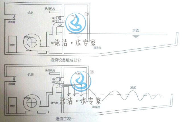 氣壓造浪系統(tǒng)主要蓄壓室、風機、閥門機構、風管系統(tǒng)、電子智能造浪是一項多學科綜合性的設備工程,它涉及空氣動力學、波浪力學、機械學、電氣控制系統(tǒng)學等幾門學科。但關于波浪產(chǎn)生的基本原理,可以形象而通俗的概括為一句成語興風作浪。它與海嘯產(chǎn)生原理基本一致,都是由于壓力的變化而形成波浪。