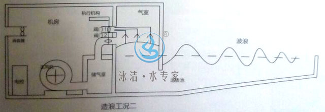 氣壓式造浪機是將高壓離心風機鼓出的強大氣流引入氣壓室,通過周而復始的吹抽排高壓空氣,壓迫氣壓室內的自由水面興起波浪。改變抽排氣流的變換頻率和氣壓大小,既可改變波浪的大小和浪型。
